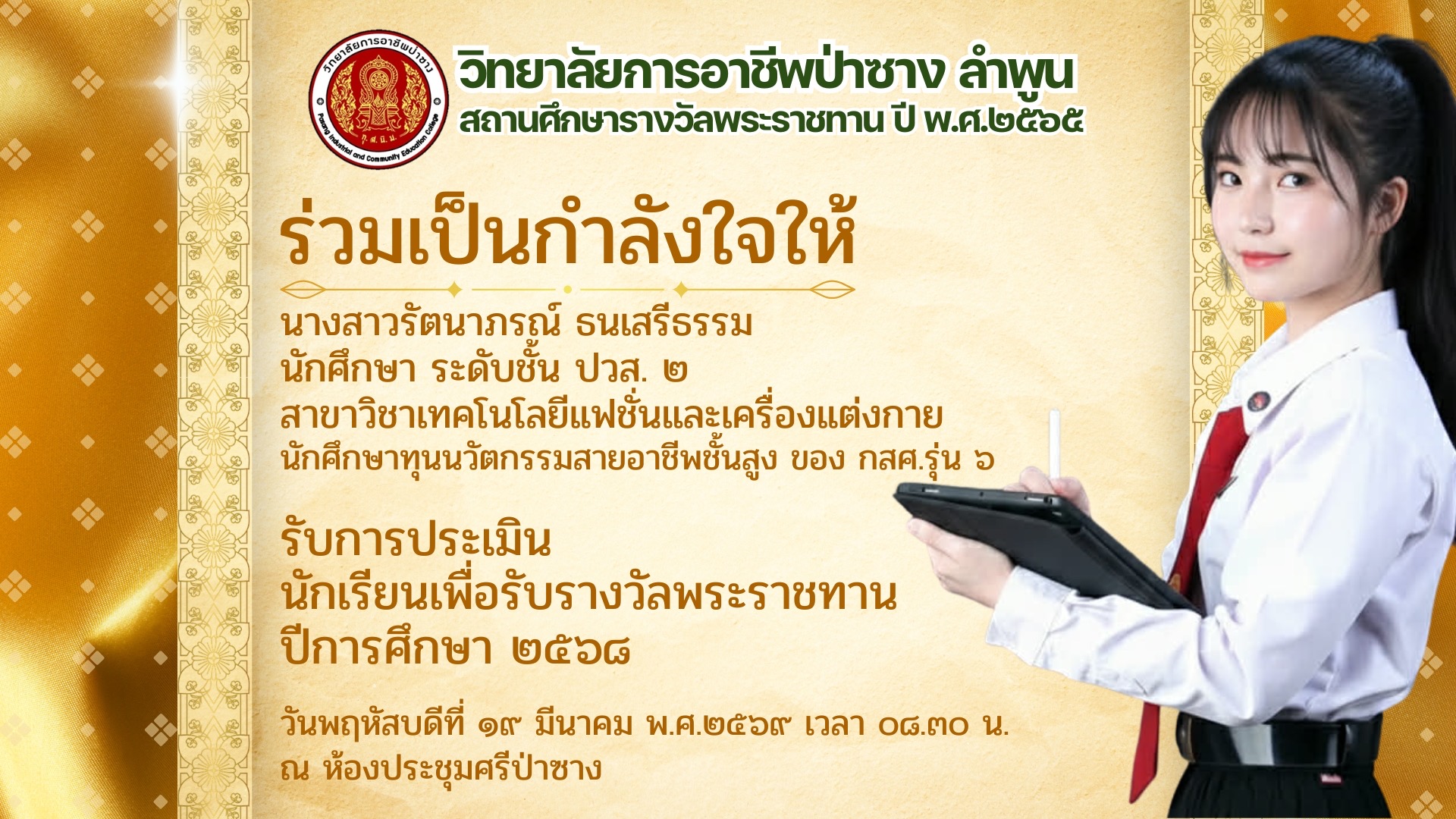 วันที่ 4 พฤศจิกายน 2566 ณ หอประชุมอาคารเฉลิมพระเกียรติ วิทยาลัยการอาชีพป่าซาง ลำพูน…